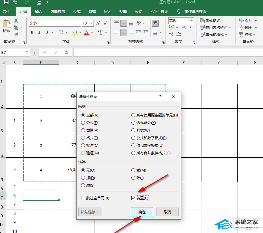 6、进入“选择性粘贴”页面之后,我们在页面中将“转置”选项进行勾选,然后点击“确定”选项即可。