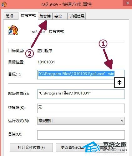 4. 如果问题依旧,则在红警运行快捷方式上单击右键,选择属性,在快捷方式启动加后缀 -win