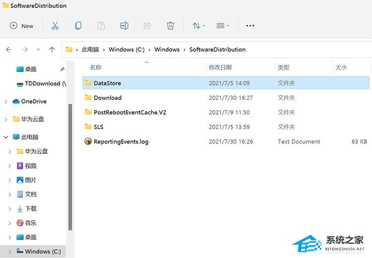 3、打开【C:\Windows\SoftwareDistribution】文件夹,删除【DataStore】和【Download】文件夹。