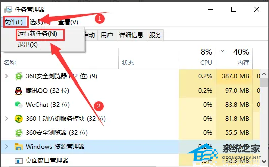 4、点击任务管理器左上角的“文件”,点击“运行新任务”这个选项。