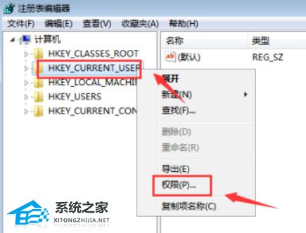 4、在注册表编辑器中,找到 HKEY_CURRENT_USER,右击选择“权限”。