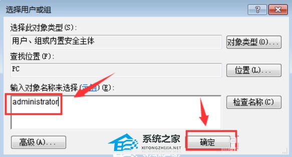 6、在“对象名称”一栏输入刚才记录的用户名,点击确定。