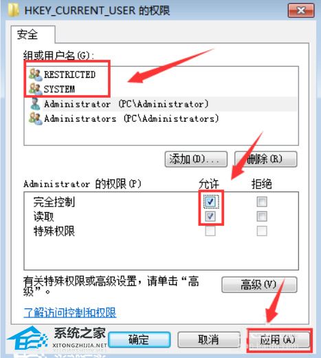 7、回到权限窗口,现在“组或用户名”中会多出一个用户,并且默认处于选中状态。单击勾选权限栏“完全控制”后面的复选框,然后按“确定”保存设置。