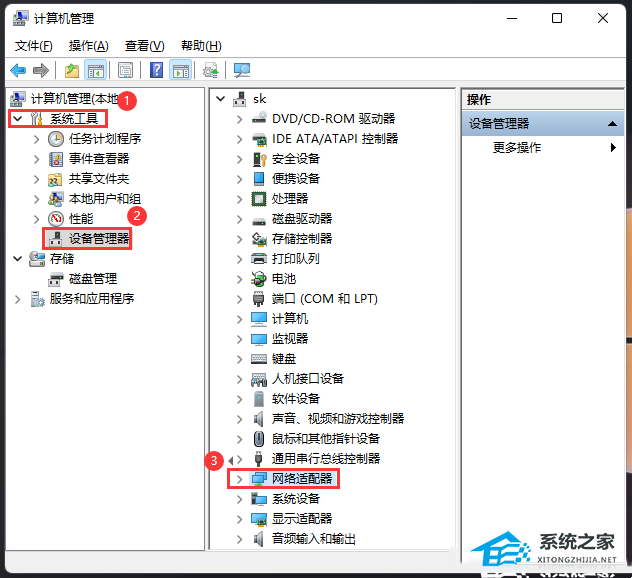 2、计算机管理窗口,左侧点击【系统工具】- 【设备管理器】,然后在右侧,找到并点击【网络适配器】。