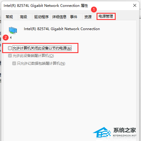 4、网卡设备属性窗口,切换到【电源管理】选项卡,【取消勾选】允许计算机关闭此设备以节约电源,然后点击【确定】。
