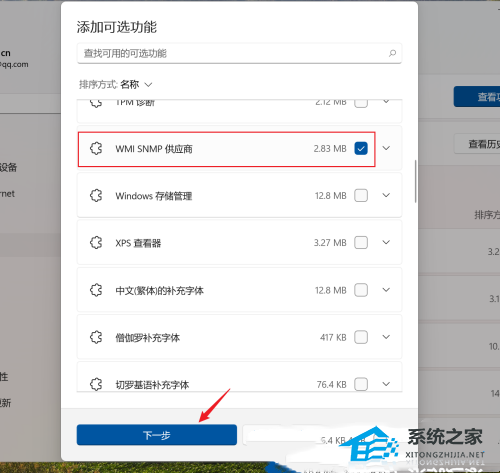 4、找到并勾选【WMI SNMP 供应商】,再点击【下一步】。