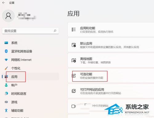 2、Windows 设置窗口,左侧点击【应用】,右侧点击【可选功能(你的设备的额外功能)】。
