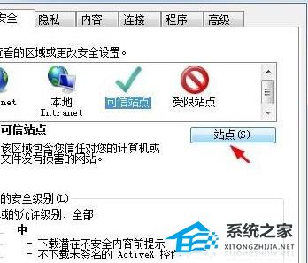 3、在弹出界面选择“安全”点击“可信站点”。