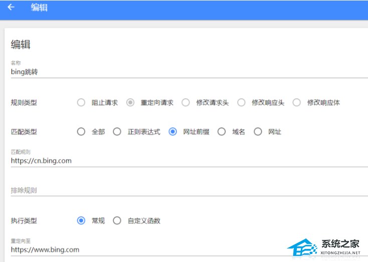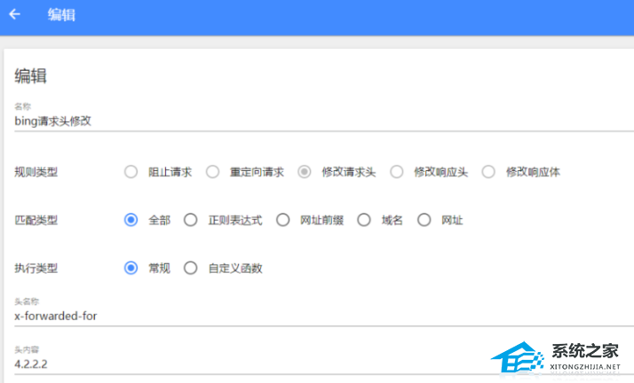 2、点击扩展新建规则修改bing的请求头,头名称x-forwarded-for,内容4.2.2.2。
