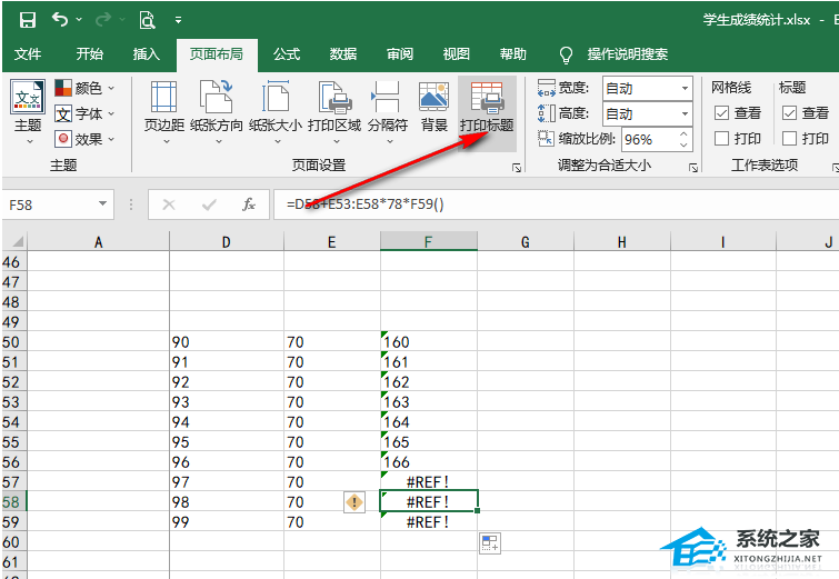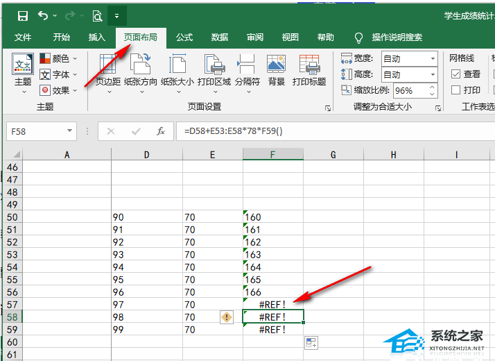 2、进入Excel页面之后,我们在该页面中可以看到表格中的错误值,我们直接点击工具栏中的“页面布局”选项。
