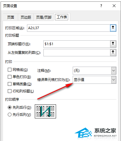 4、进入页面设置的工作表页面之后,我们在该页面中找到“错误单元格打印为”选项,可以看到该选项右侧的设置为“显示值”。