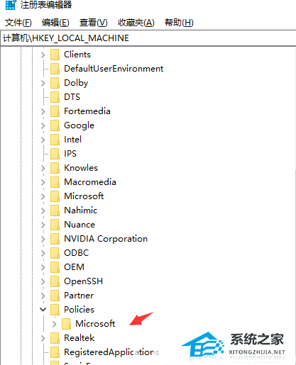 3、然后在打开的注册表编辑器窗口中定位到”HKEY_LOCAL_MACHINE\SOFTWARE\Policies\Microsoft“注册表项。