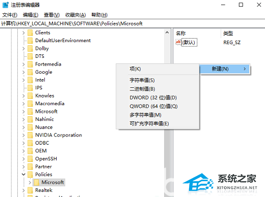 4、右键点击Microsoft注册表项,在弹出菜单中依次点击“新建/项”菜单项。
