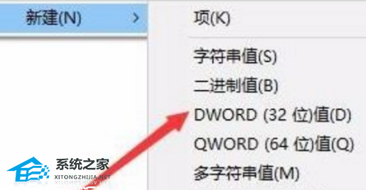 6、然后点击刚刚新建的注册表项,在右侧的空白位置点击右键,在弹出菜单中依次点击“新建/Dword(32位)值”菜单项。