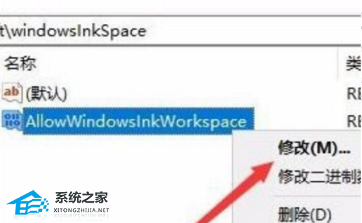 7、把刚刚建立的新注册表键值重命名为AllowWindowsInkWorkspace,同时右键点击该键值,在弹出菜单中点击“修改”菜单项。