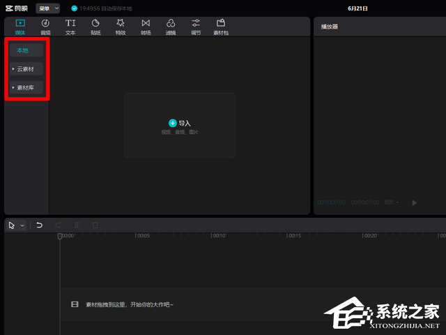 2、在剪映界面,可以通过本地、云素材、素材库来导入素材,以本地为为例,点击导入选项。