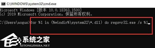 4、在其中输入“for %1 in (%windir%\system32\*.dll) do regsvr32.exe /s %1”回车确定,用来重新注册所有的dll文件。