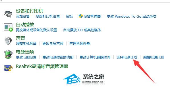 3、然后找到其中的电源选项,点击下方的“选择电源计划”。