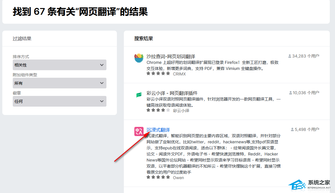 3、在“网页翻译”的搜索结果中,我们找到“沉浸式翻译”插件,点击打开该插件。