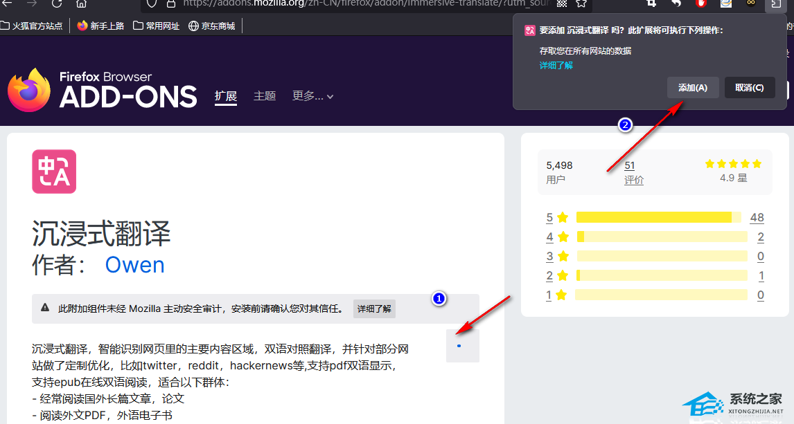 4、在“沉浸式翻译”插件页面中我们先点击“添加到FireFox”选项,再在右上角的弹框中点击“添加”选项。