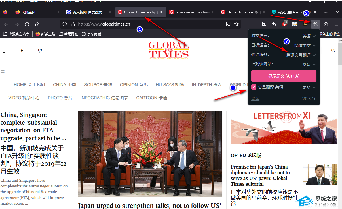 6、接着我们打开一个英文网站,然后在工具栏中打开沉浸式翻译插件的图标,将“翻译服务”改为“腾讯交互翻译”因为原本的谷歌翻译引擎可能无法使用,再将“总是翻译英语”选项进行勾选,然后等待一会我们就能看到网站中的英文内容都被翻译为英文了,如果插件加载慢,或是最上方的选项无法翻译,我们可以移除该插件,再安装一次。