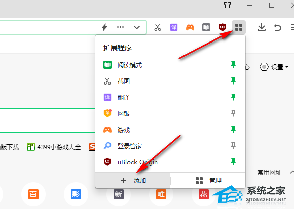 1、我们先在电脑中点击打开360安全浏览器,然后在浏览器页面中打开扩展管理图标,再在下拉列表中点击选择“添加”选项。