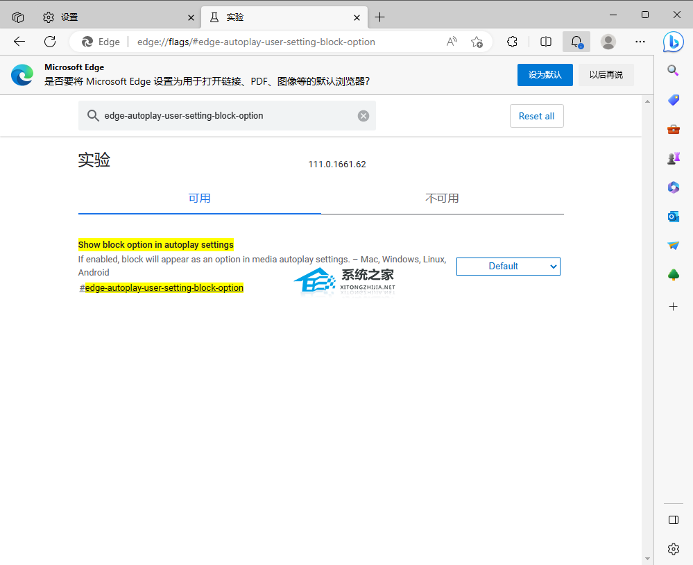 2、在 Edge 稳定版中也可以通过启用实验性 Flag 来实现,在地址栏上访问“edge://flags/#edge-autoplay-user-setting-block-option”,重启浏览器后就可以重新看到“阻止”选项。