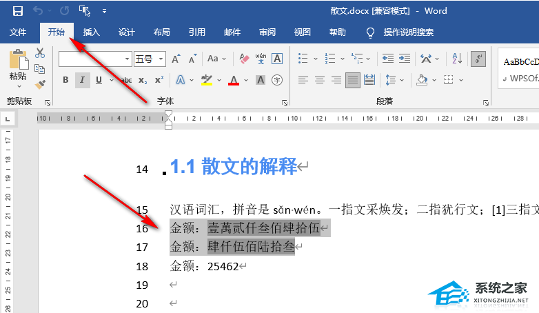 2、打开word文档之后,我们先选中文中需要添加删除线的内容,然后在工具栏中打开“开始”工具。
