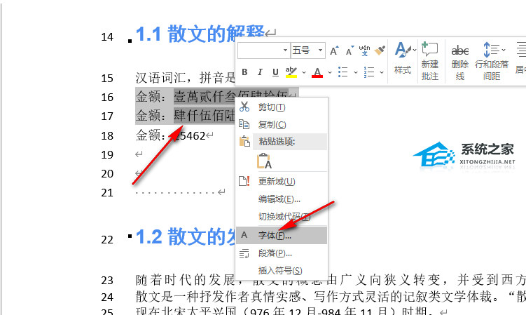 4、我们也可以在选中文章内容之后直接右键单击选中内容,然后在菜单列表中点击选择“字体”选项。