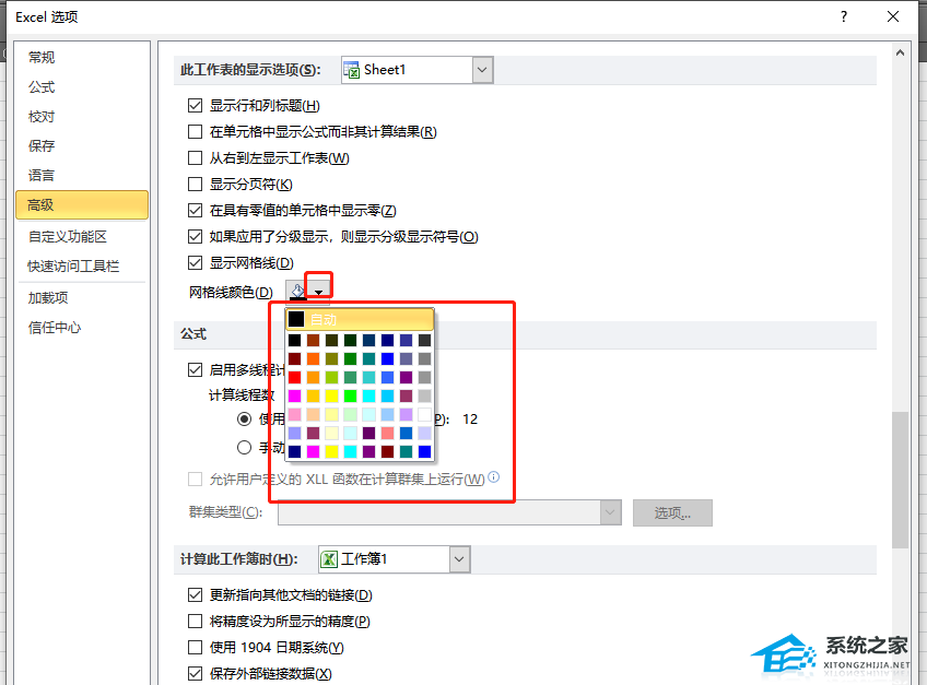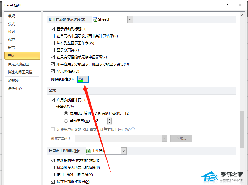4、用户在右侧页面中需要下划页面,找到此工作表的显示选项板块,然后点击网格线颜色右侧的下拉箭头,在拓展出来的选项卡中用户选择自己喜欢的颜色即可。