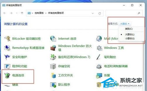 2、在控制面板窗口中,查看方式选择大图标,找到“电源选项”,点击进入。