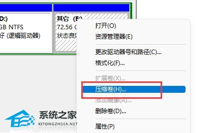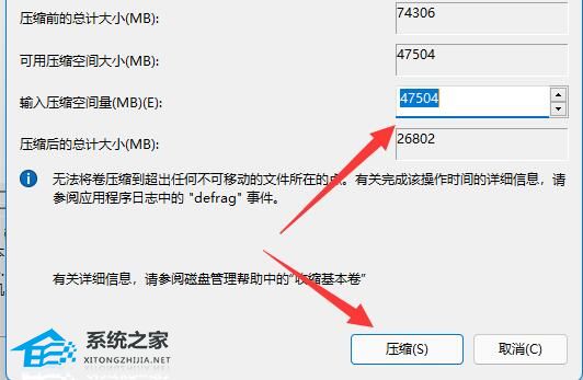 5、然后选择被合并的分区空间量,再点击“压缩”。