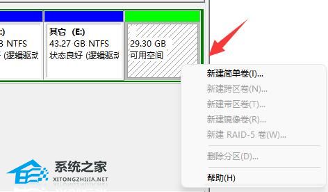 6、压缩完成后,右键新增的可用空间,选择“新建简单卷”。