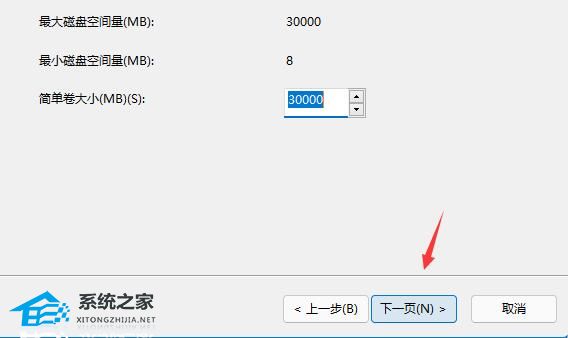 7、然后选择分区大小,并持续点击“下一页”。(其余设置保持默认)