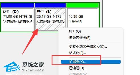 3、删除后,右键旁边的磁盘,点击“扩展卷”。