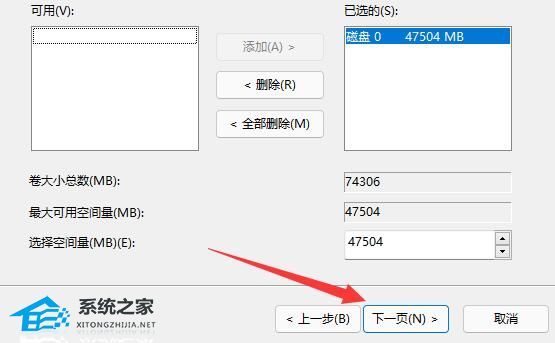 4、最后选择空间量并连续点击“下一页”就可以合并回分区了。