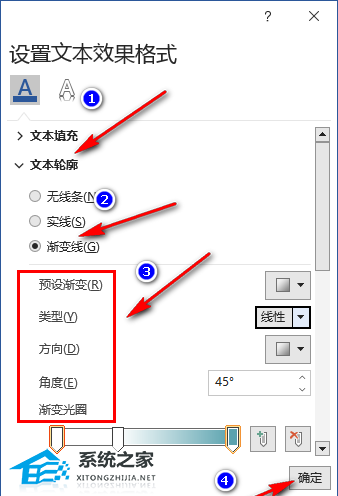 4、进入文本效果页面之后,我们在该页面中打开“文本轮廓”选项,然后在下拉列表中点击“渐变线”选项,接着完成渐变、类型、方向以及角度等选项的设置并点击“确定”选项即可。