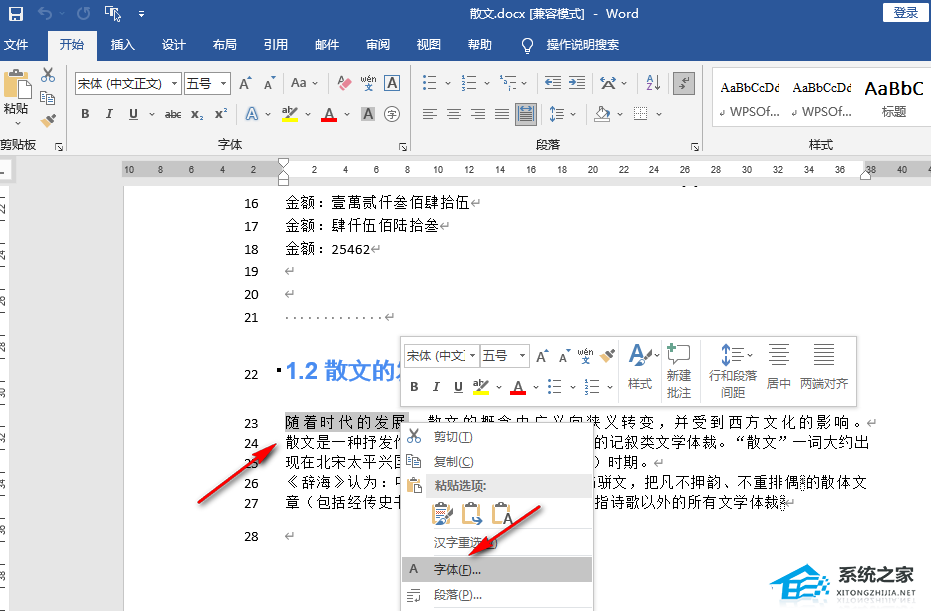 2、进入Word页面之后,我们在文章页面中先选中一段需要添加纯色填充效果的文字,然后右键单击选择“字体”选项。