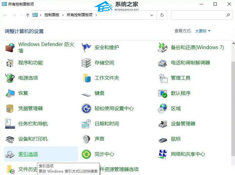 2、所有控制面板项窗口,切换到【大图标】查看方式,调整计算机的设置下,找到并点击【索引选项(更改 Windows 索引方式以加快搜索速度)】。