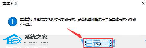 5、重建索引提示框,重建索引可能需要很长时间才能完成。某些视图和搜索结果在重建完成前可能不完整。点击【确定】。