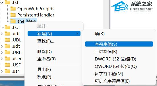 3. 之后在 .txt 文件夹下查看是否有一个 shellNew文件夹,如果没有需要 右键->新建->项 命名为shellNew 如果有跳过该步骤。在shellNew文件夹上右键->新建->字符串值 然后将名称改为 nullfile ,数值数据空白即可。