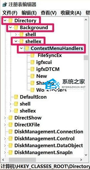 3. 接下来我们在HKEY_CLASSES_ROOT展开项中找到:Directory,再依次展开:Directory\Background\shellex\ContextMenuHandlers。