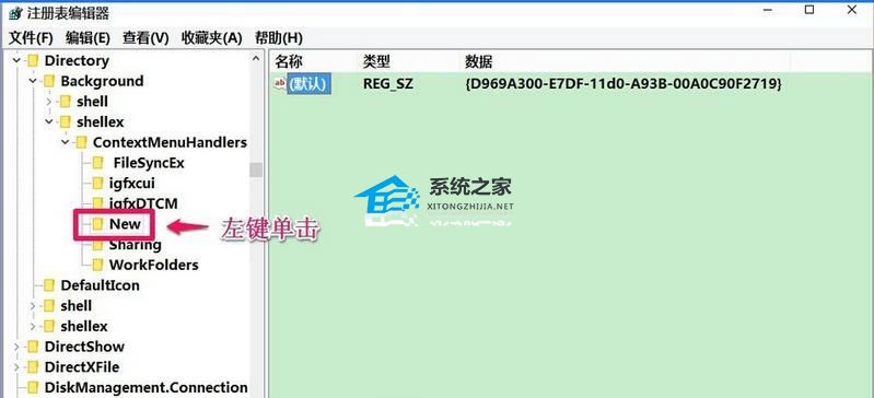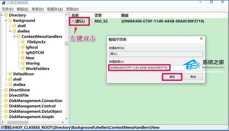 5. 此时,在New对应的右侧窗口,我们可以看到默认的数值数据为:{D969A300-E7DF-11d0-A93B-00A0C90F2719},左键双击:默认,在弹出的编辑字符串的对话框中,把数值数据更改为:{D969A300-E7FF-11d0-A93B-00A0C90F2719},再点击:确定。之后重启电脑即可。