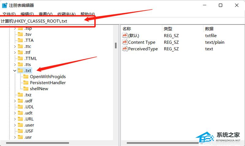 2. 在上边搜索栏直接输入 HKEY_CLASSES_ROOT.txt 命令进行搜索后会跳转到指定页面。双击 “(默认)” 后弹出提示框,查看数值是否为 txtfile ,如果不是需要将值改为 txtfile。