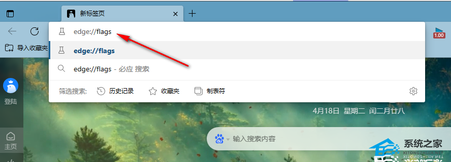 1、我们先在电脑中打开Edge浏览器,然后在浏览器的网址框中输入“edge://flags”,然后点击回车键。