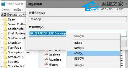 3、接下来依次展开:HKEY_CURRENT_USER\Software\Microsoft\Windows\CurrentVersion\Explorer\User Shell Folders,在右侧窗口找到并双击名称为Desktop的字符串值,删除原来的数值数据,将之前复制的数值数据粘贴进入,然后点击“确定”退出注册表编辑器。