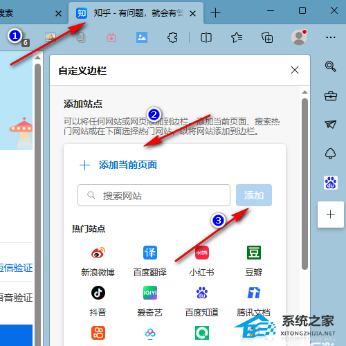 5、我们还可以打开一个网页,然后点击边栏中的“+”图标进入自定义边栏页面,接着点击“添加当前页面”选项,或是在搜索框中输入网站网址,然后点击“添加”选项。
