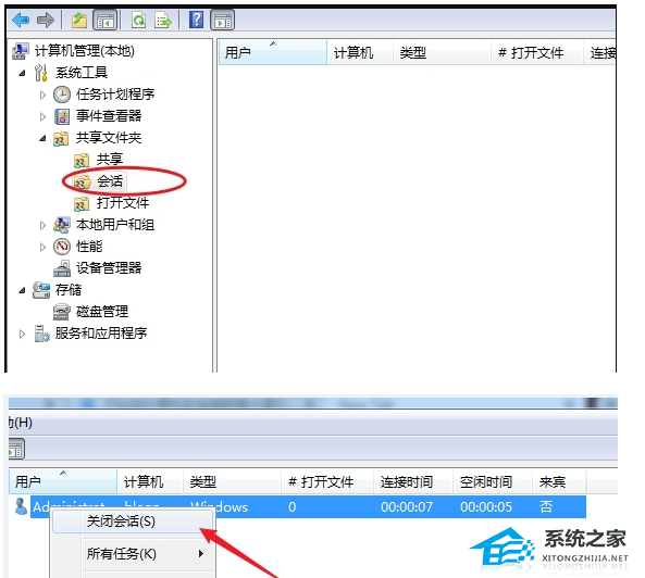 2. 点击【会话】选项,可以在右侧窗口看到当前连接的所有会话记录。选择要删除的记录,右键选择【关闭会话】。
