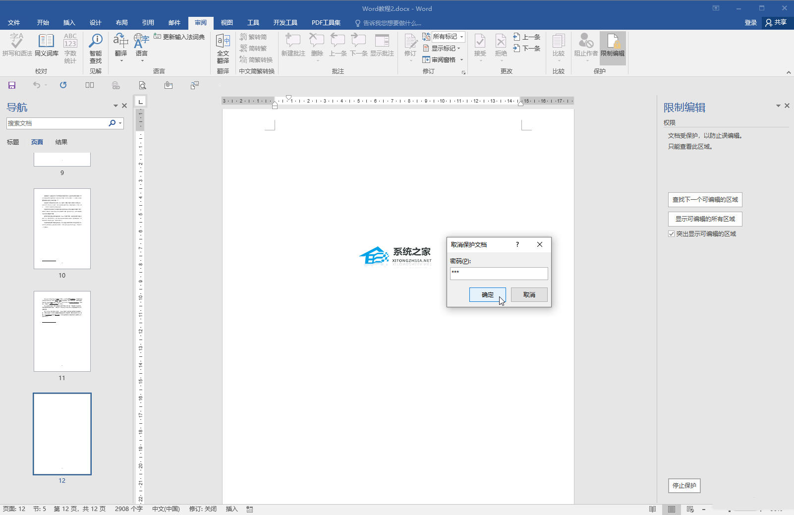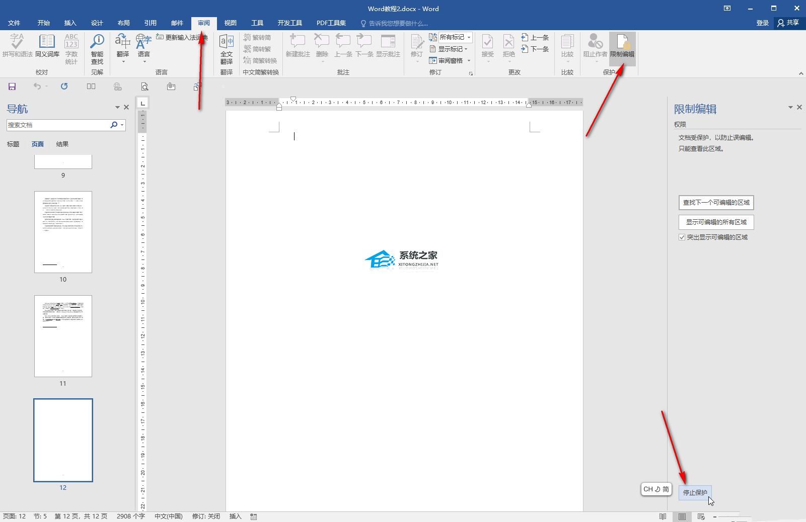 1、在“审阅”选项卡中点击“限制编辑”,在打开的侧边栏底部点击“停止保护”;
