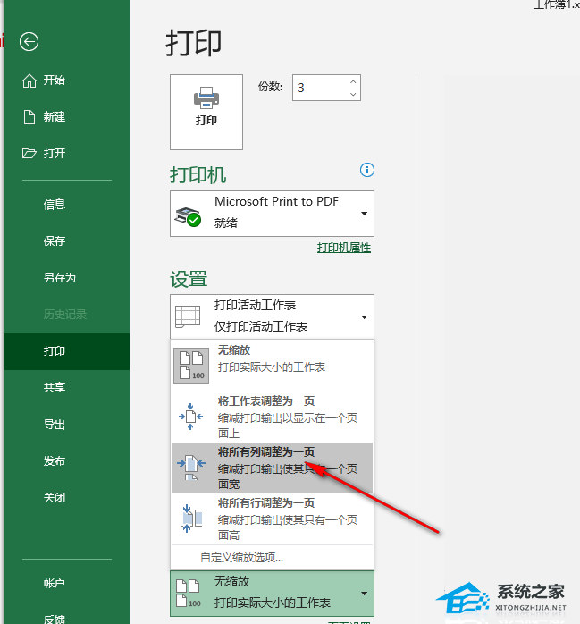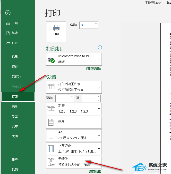 3、在“文件”页面中,我们先点击“打印”选项,再在打印页面中找到“无缩放”选项。